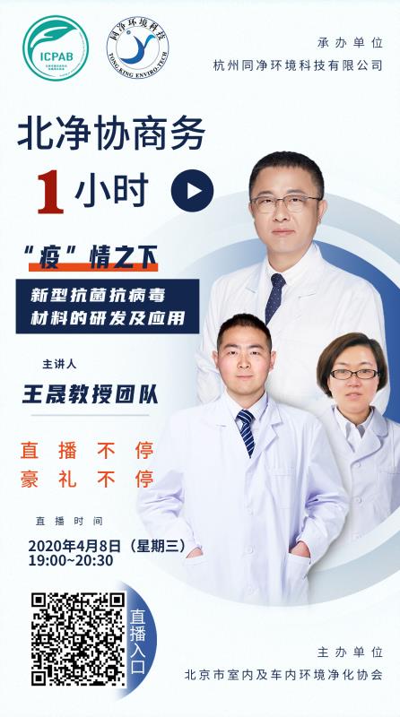 北净协商务1小时于4月8日晚19:00准时开播!本期由杭州同净环境科技有限公司与北净协共同主办!主讲人:王晟教授团队。从专业角度讲解“疫”情之下,新型抗菌抗病毒材料的研发及应用。内容精彩,不见不散。